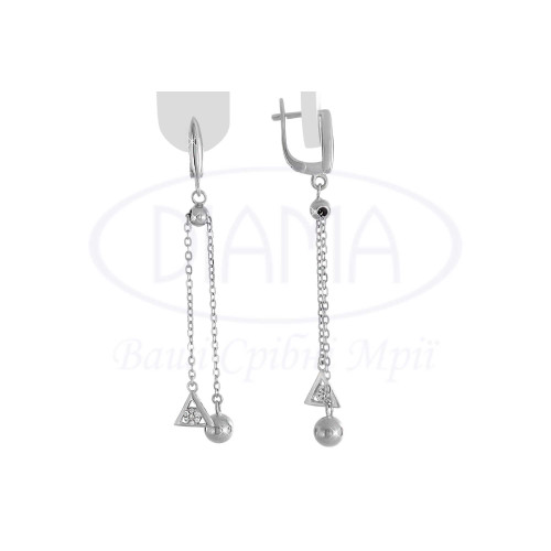 Срібні сережки з геометричними фігурами та білим цирконом. Срібло 925 проби, покрите родієм.