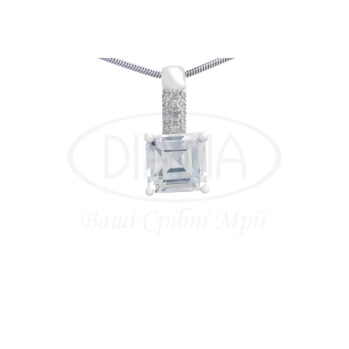 Підвіска срібна з білим цирконом у формі квадрату. Срібло 925 проби, покрите родієм. В комплекті каблучка, сережки та підвіска. Розмір камня 8,5 мм × 8,5 мм