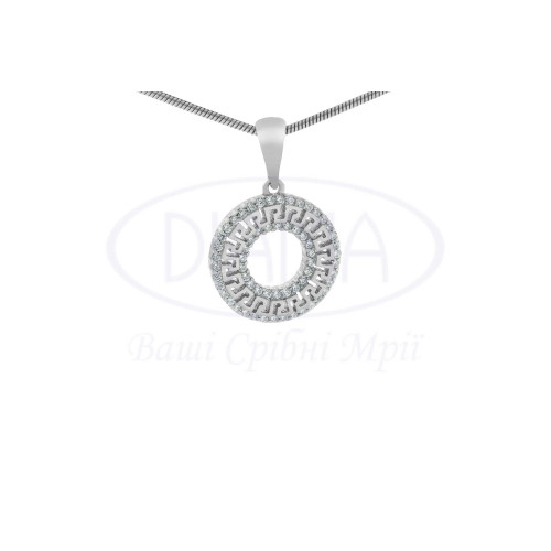 Підвіска срібна з білим цирконом, виконана у формі кола. Срібло 925 проби, покрите родієм. Діаметр кола - 14 мм. В комплекті каблучка, сережки та підвіска.