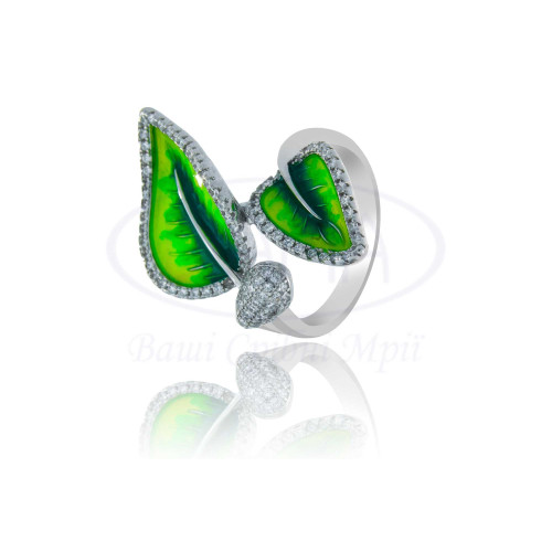 Каблучка срібна у формі листя з зеленою емаллю та білим цирконом. Срібло 925 проби, покрите родієм. В комплекті каблучка, сережки та підвіска.