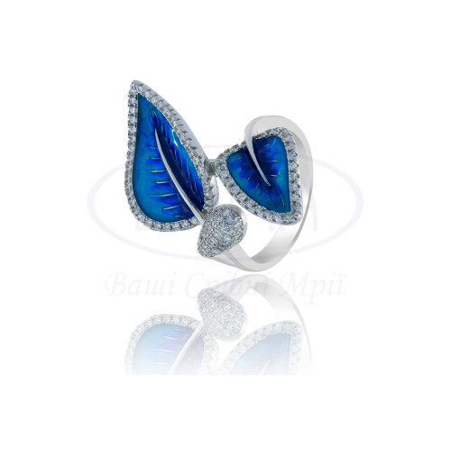 Каблучка срібна у формі листя з синьою емаллю та білим цирконом. Срібло 925 проби, покрите родієм. В комплекті каблучка, сережки та підвіска.