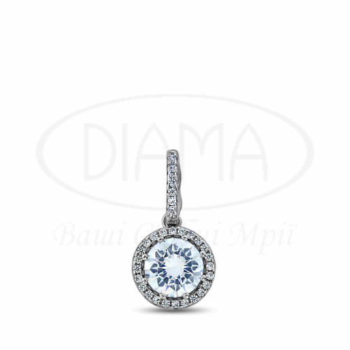 Срібна підвіска з білим цирконом у формі круга. Срібло 925 проби, покрите родієм. Діамерт головного елементу підвіски (круг) 10 мм. В наборі каблучка, підвіска та сережки.