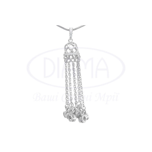 Срібна підвіска у формі дзвіночка, на якому прикріплені ланцюжки з цирконом. Срібло 925 проби, покрите родієм. В наборі присутня каблучка, сережки та підвіска.