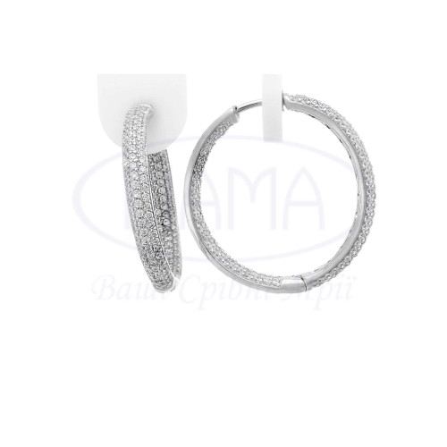 Сережки срібні з білим цирконом. Срібло 925 проби, покрите родієм. Товщіна 4 мм, діаметр 29 мм.