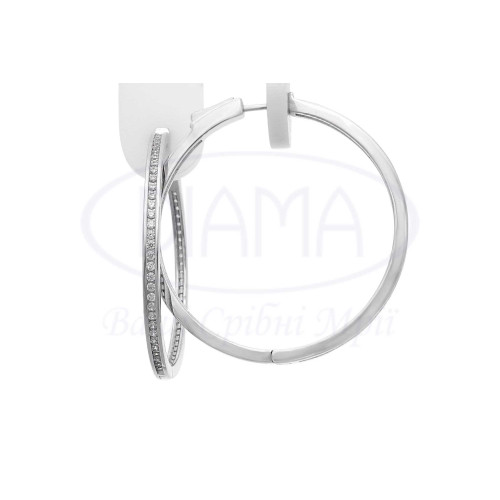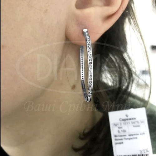 Сережки срібні з білим цирконом. Срібло 925 проби, покрите родієм. Розмір сережки 39.5 мм, ширина 2.5 мм.