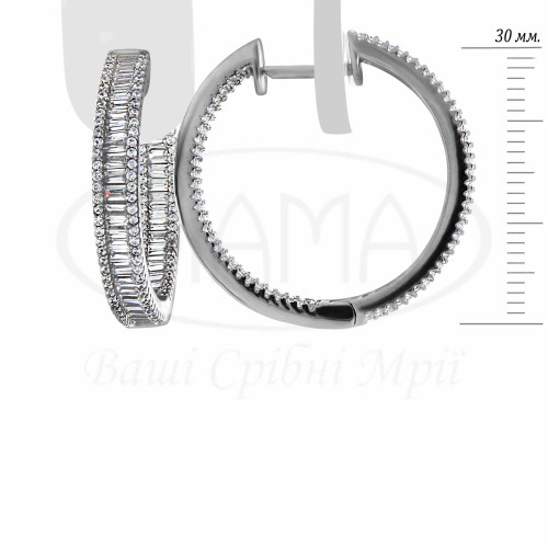 Сережки срібні з білим цирконом. Срібло 925 проби, покрите родієм. Розмір сережки 30 мм, ширина 4.9 мм.