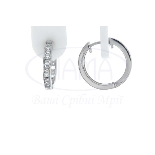 Сережки срібні з білим цирконом. Срібло 925 проби, покрите родієм. Висота сережки 19.5 мм, ширина 3 мм. На задній стінці вирізи в формі серця.