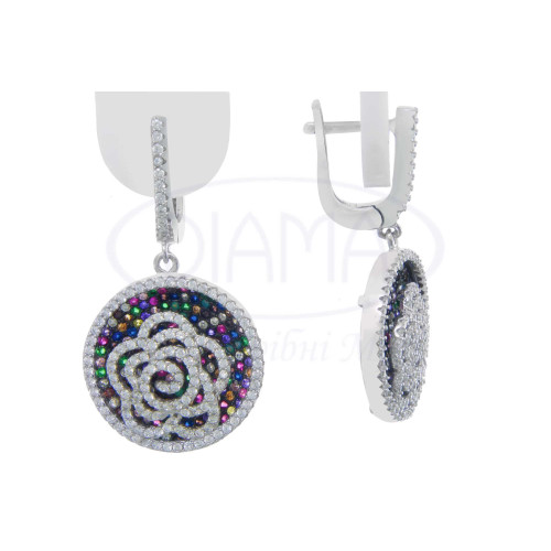Сережки срібні у формі круга з кольоровим цирконом. Срібло 925 проби,покрите родієм. У наборі присутні каблучка, сережки та підвіска.