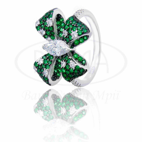 Срібна каблучка в формі "Бант" з зеленим та білим цирконом. Срібло 925 проби, покрите родієм.