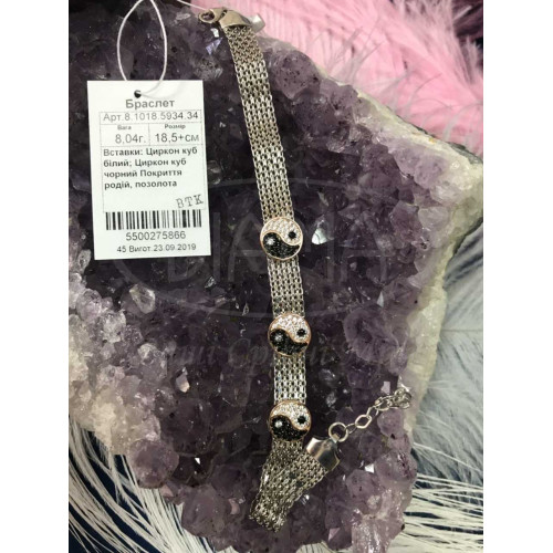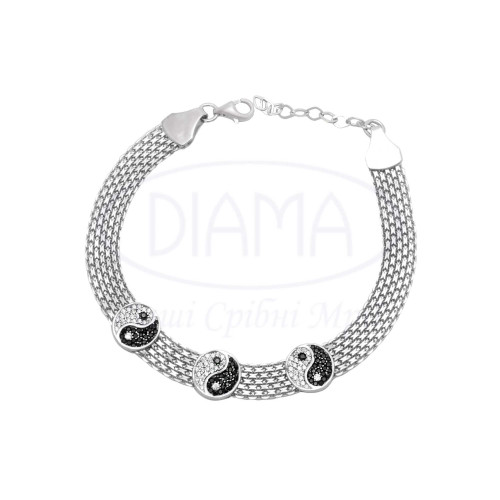 Браслет срібний в стилі Пандора (Pandora) з прикрасою у вигляді знаку "Інь - Янь" з білим та чорним цирконом. Срібло 925 проби, покрите родієм.