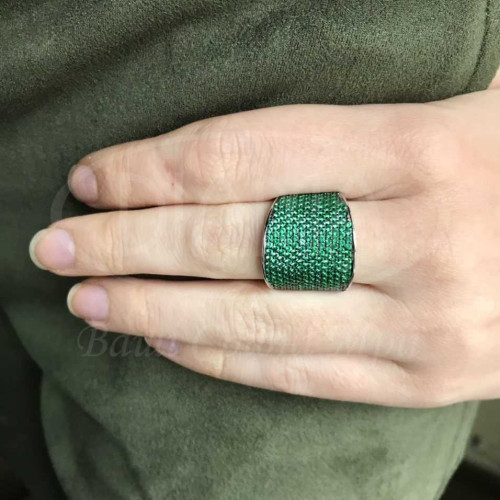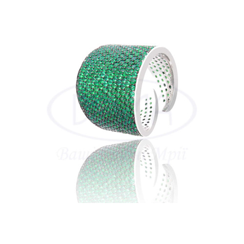Срібна каблучка з зеленим цирконом. Срібло 925 проби, покрите родієм. Ширина 19 мм.