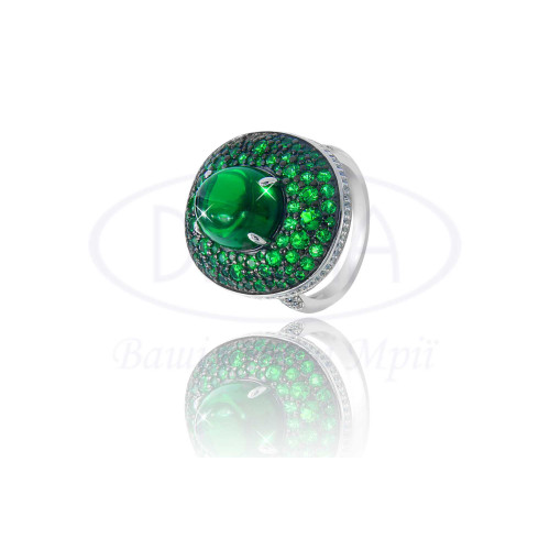 Каблучка срібна з зеленим та білим цирконом у формі овала. Срібло 925 проби, покрите родієм. Розмір камня 10х12 мм. Розмір овала 10х12 мм.