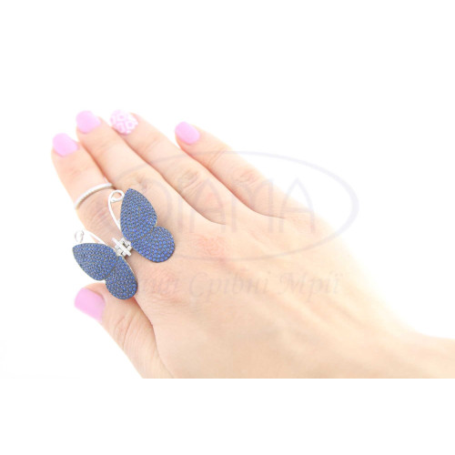 Каблучка срібна з рухомим механізмом (при згинанні пальця, рухаються крила метелика). Вставка з білого та синього циркону. Срібло 925 проби, покрите родієм.