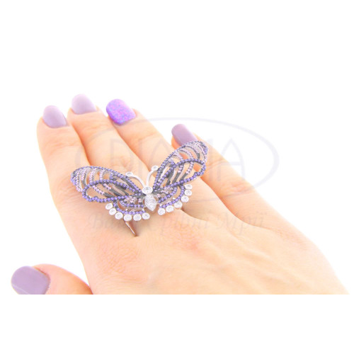 Срібна каблучка в формі Метелика з білим, рожевим та фіолетиовим цирконом. Срібло 925 проби, покрите родієм.