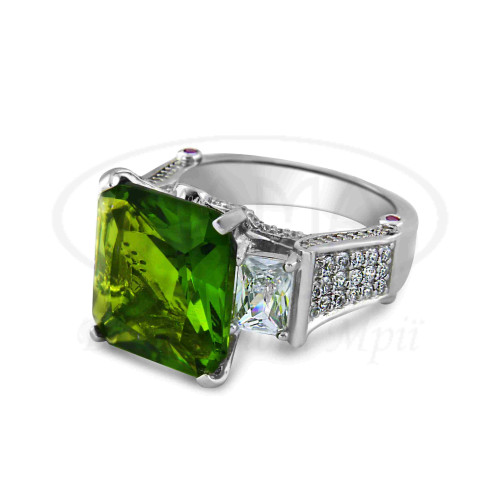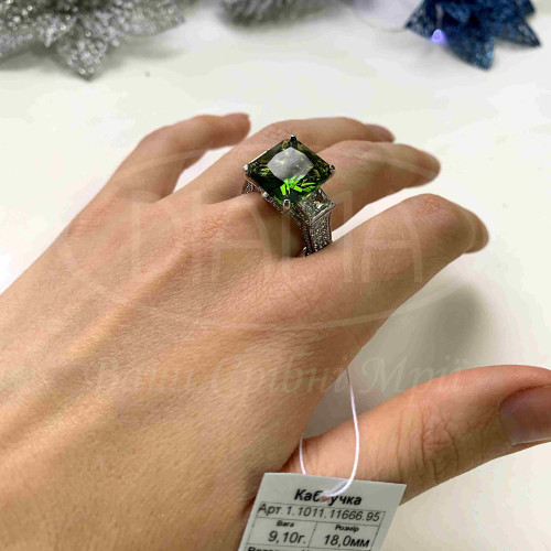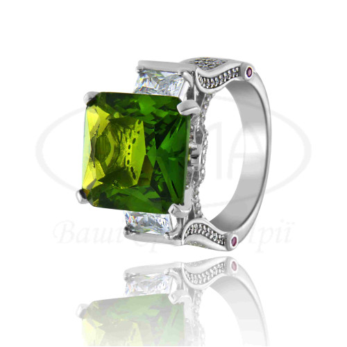 Каблучка срібна з смарагдовим, білим та рожевим цирконом у формі прямокутника. Срібло 925 проби, покрите родієм. Розмір камня 12,5х13,5 мм.