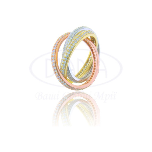 Срібна потрійна каблучка з білим цирконом. Срібло 925 проби, покрите родієм, жовтою та червоною позолотою. В наборі присутні каблучка, сережки та підвіска.