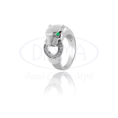 Каблучка срібна у формі Пантери та круга з білим та зеленим цирконом. Срібло 925 проби, покрите родієм. Розмір головного елементу каблучки 9,5 мм. Діаметр круга 11,5 мм.