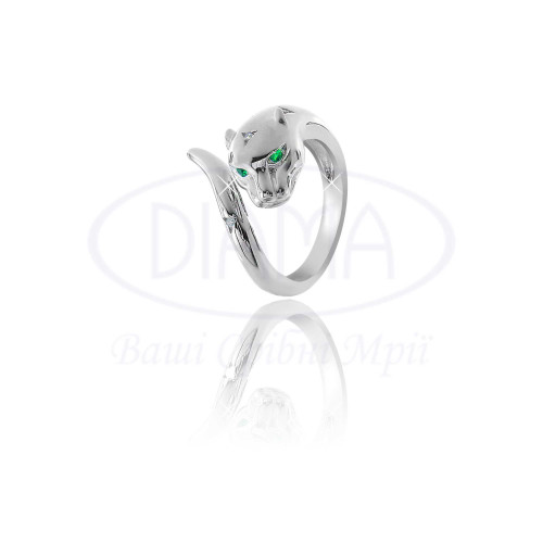 Каблучка срібна у формі Пантери з білим та зеленим цирконом. Срібло 925 проби, покрите родієм. Розмір головного елементу каблучки 8,5 мм.