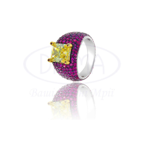 Срібна каблучка з малиновим та жовим цирконом. Срібло 925 проби, покрите родієм та позолотою. Ширина каблучки 14 мм, камінь 11*9 мм.