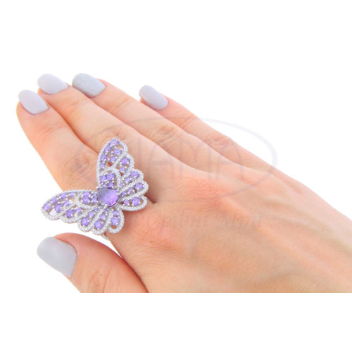 Каблучка срібна у формі Метелика з фіолетовим та білим цирконом. Срібло 925 проби, покрите родієм.