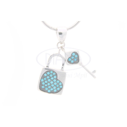 Срібна підвіска з замком та ключем. Вставка- бірюза. Срібло 925 проби, покрите родієм.