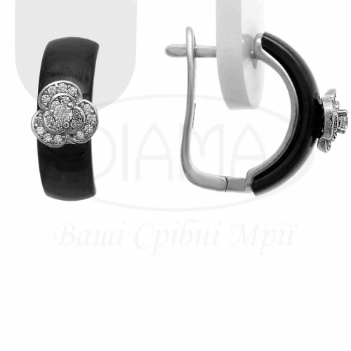 Сережки з чорної кераміки зі сріблом 925 проби у формі квітки. Срібло родоване. В комплекті також є каблучка.