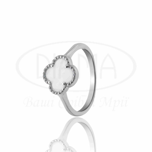 Каблучка срібна з білою керамікою. Срібло 925 проби, покрите родієм. Каблучка виготовлена в формі "Клевер". Розмір головного елементу 11 мм.