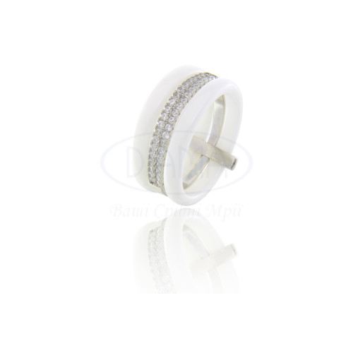 Каблучка срібна з білою ювелірною керамікою, а також з подвійною доріжкою з білого циркону. Срібло 925 проби, покрите родієм.