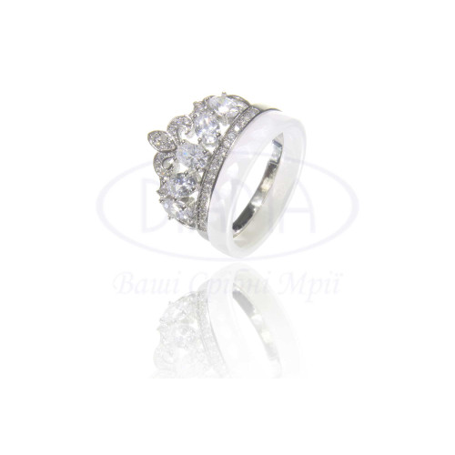 Срібна каблучка у формі корони з білою граненою керамікою та білим цирконом. Срібло 925 проби, покрите родієм.