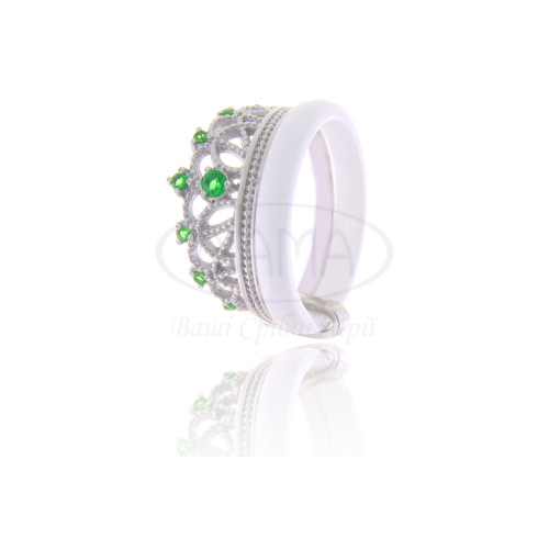 Каблучка срібна Корона з зеленим цирконом та білою керамікою. Срібло 925 проби, покрите родієм.