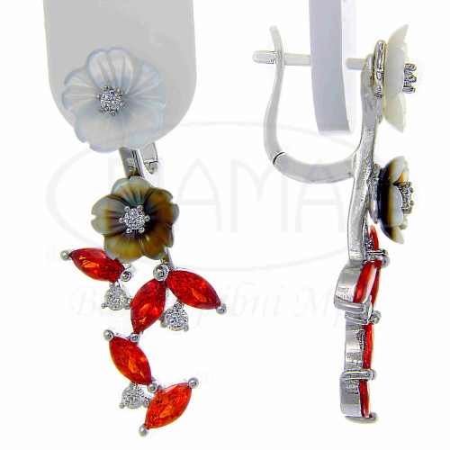 Срібні сережки з кольоровим цирконом та перламутром, в стилі Роберто Браво. Срібло 925 проби, покрите родієм. В наборі присутні каблучка, підвіска та сережки.