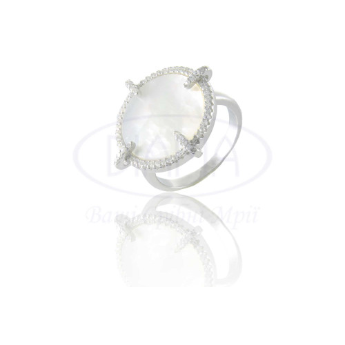 Срібна каблучка з білим перламутром та білим цирконом. Срібло 925 проби, покрите родієм. Комплект складається з каблучки, підвіски та сережок.