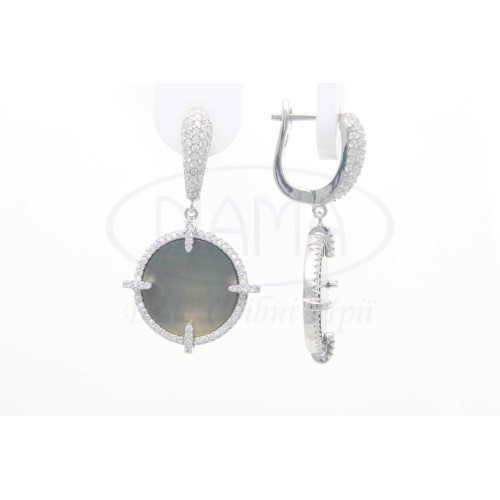 Срібні сережки з чорним перламутром та білим цирконом. Срібло 925 проби, покрите родієм. Комплект складається з каблучки, підвіски та сережок.
