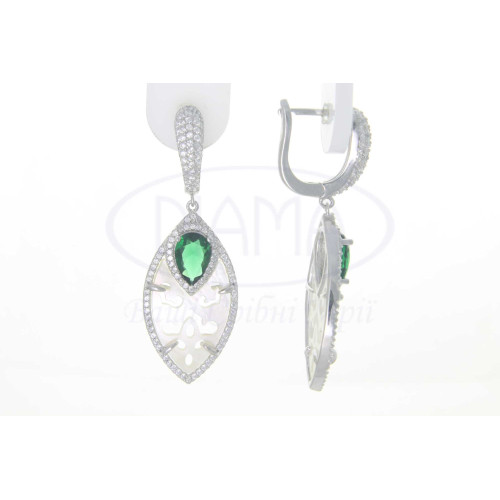 Срібні сережки з білим перламутром, зеленим та білим цирконом. Срібло 925 проби, покрите родієм. В комплекті присутні каблучка, підвіска та сережки.