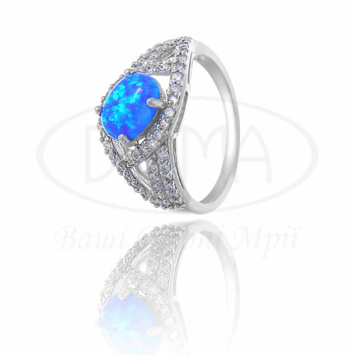 Каблучка срібна з синім опалом та білим цирконом. Срібло 925 проби, покрите родієм. В комплекті каблучка та сережки.