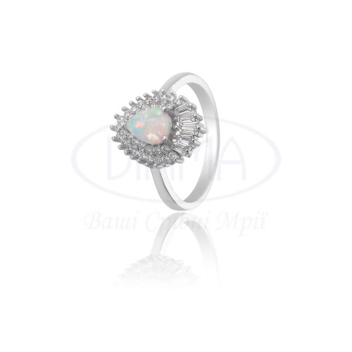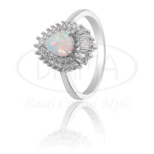 Срібна каблучка з білим Опалом та білим цирконом. Срібло 925 проби, покрите родієм. Комплект складається з каблучки, підвіски та сережок.