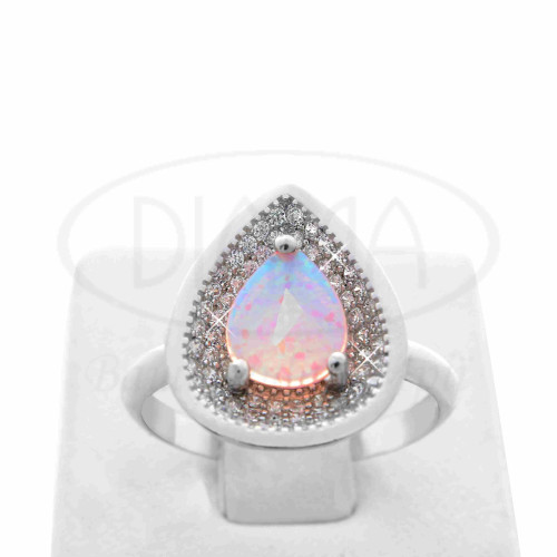 Срібна каблучка з рожевим опалом та білим цирконом в формі краплі. Срібло 925 проби, покрите родієм. В наборі присутні каблучка та сережки.