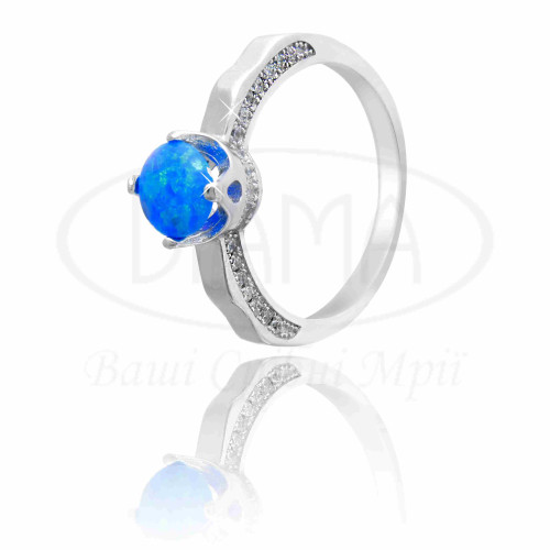 Срібна каблучка з синім круглим опалом та цирконом. Срібло 925 проби, покрите родієм. В наборі присутні Каблучка, сережки та підвіска.