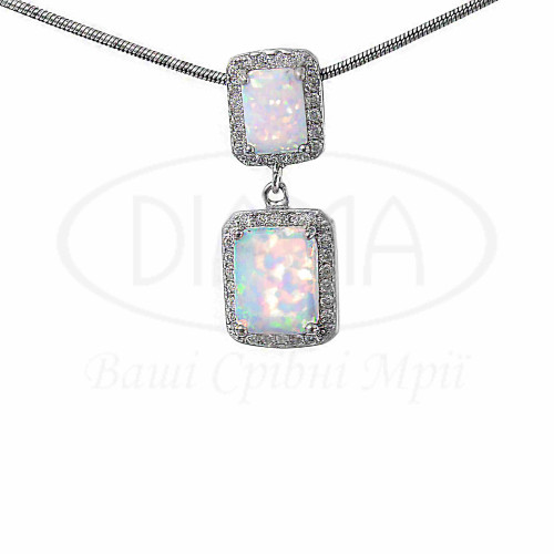 Срібна підвіска з двома прямокутними білими Опалами та білим цирконом. Срібло 925 проби, покрите родієм. Комплект складається з каблучки, підвіски та сережок.
