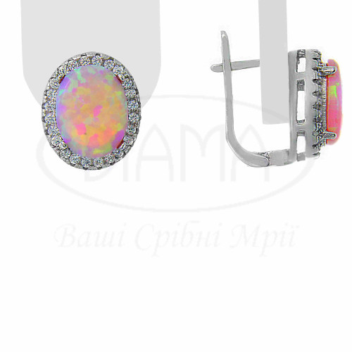 Срібні сережки з рожевим опалом та білим цирконом. Срібло 925 проби, покрите родієм. Комплект включає в себе каблучку, підвіску та сережки.
