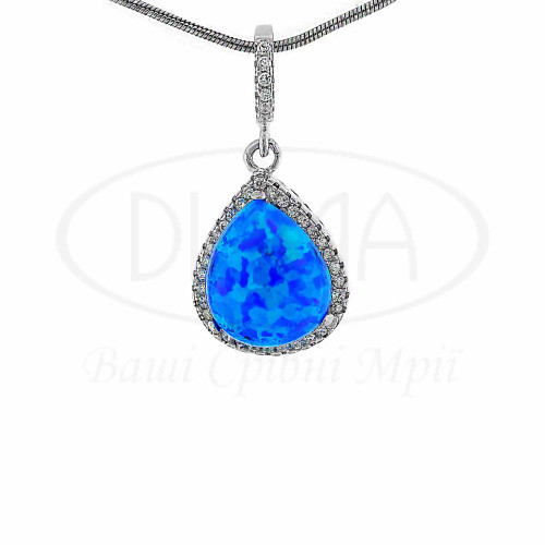 Підвіска срібна з синім опалом та білим цирконом у формі краплі. Срібло 925 проби, покрите родієм. В комплекті каблучка, підвіска та сережки.