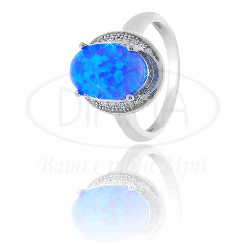 Каблучка срібна з синім опалом та білим цирконом. Срібло 925 проби, покрите родієм. В комплекті каблучка, підвіска та сережки.