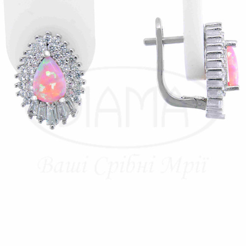 Срібні сережки з рожевим Опалом та білим цирконом. Срібло 925 проби, покрите родієм. Комплект складається з каблучки, підвіски та сережок.