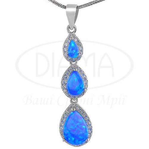 Срібна підвіска з трьома синіми Опалами та білим цирконом. Срібло 925 проби, покрите родієм. В наборі присутні каблучка, підвіска та сережки.