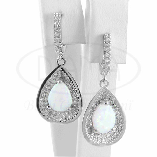 Срібні сережки з білим опалом та білим цирконом в формі краплі. Срібло 925 проби, покрите родієм. В наборі присутні каблучка та сережки.