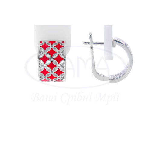 Срібні сережки з кольоровою емаллю та білим цирконом із зображенням ромбів. Срібло 925 проби, покрите родієм. В комплекті каблучка, сережки та підвіска. Розмір сережки 10х16 мм.