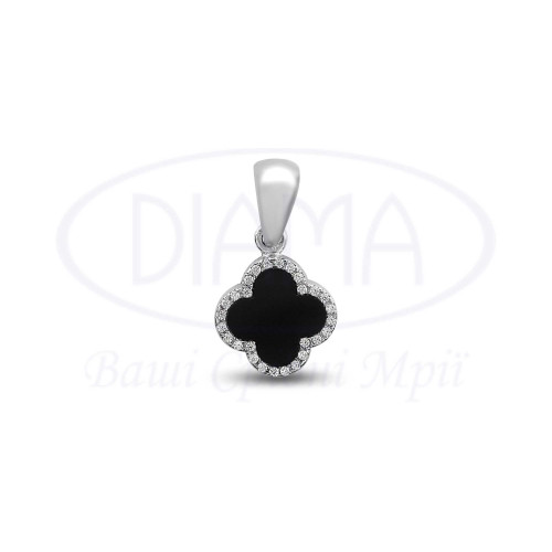 Срібна підвіска з оніксом та білим цирконом. Срібло 925 проби, покрите родієм. Підвіска виготовлено в формі "Клевер". Розмір головного елементу - 12,5 мм. Підвіска власного виробництва. У комплекті підвіска та сережки.