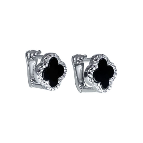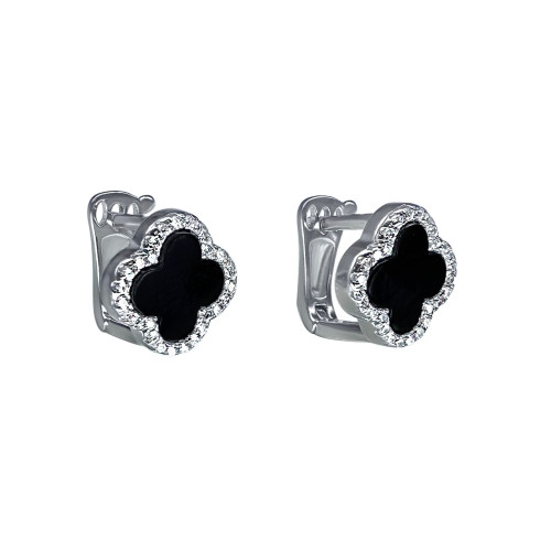 Сережки срібні з Оніксом та білим цирконом. Срібло 925 проби, покрите родієм. Сережки виготовлені в формі "Клевер". Розмір головного елементу 11,5 мм.