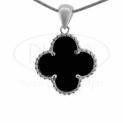 Срібний підвіс з оніксом. Срібло 925 проби, покрите родієм. Підвіс виготовлено в формі "Клевер". В наборі присутні каблучка, сережки, кольє та підвіс. Розмір головного елементу - 15 мм.