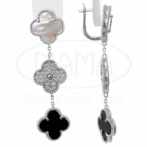 Сережки срібні з білим перламутром, оніксом та білим цирконом. Срібло 925 проби, покрите родієм. Сережки виготовлено в формі "Клевер". В наборі присутні каблучка, кольє, сережки та браслет. Розмір головних елементів - 15 мм.
